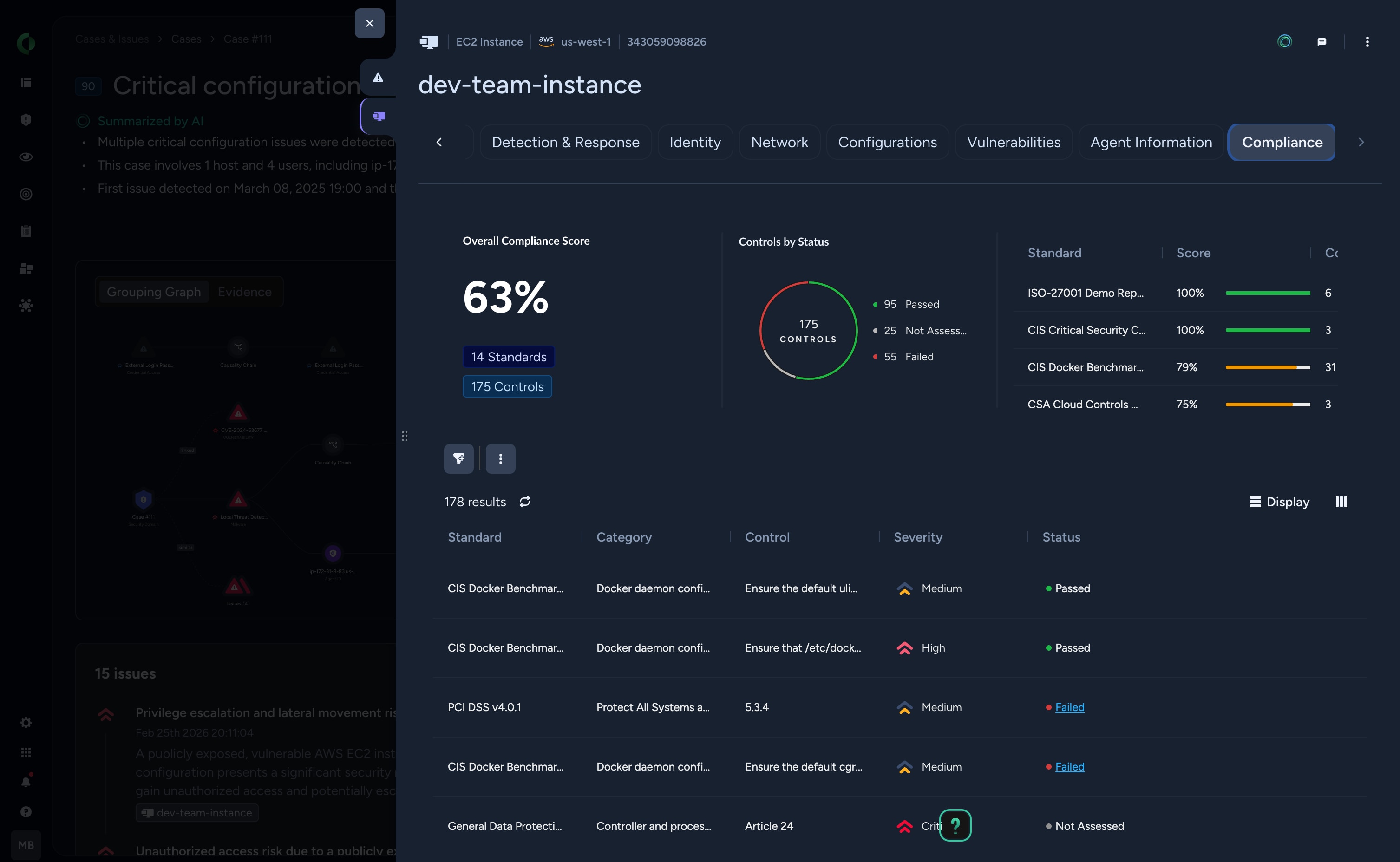 Offri un livello di sicurezza della conformità e uno stato in tempo reale su host dinamici, container e funzioni serverless. Esegui controlli di conformità e reporting per i principali framework e implementa policy per controlli personalizzati.
