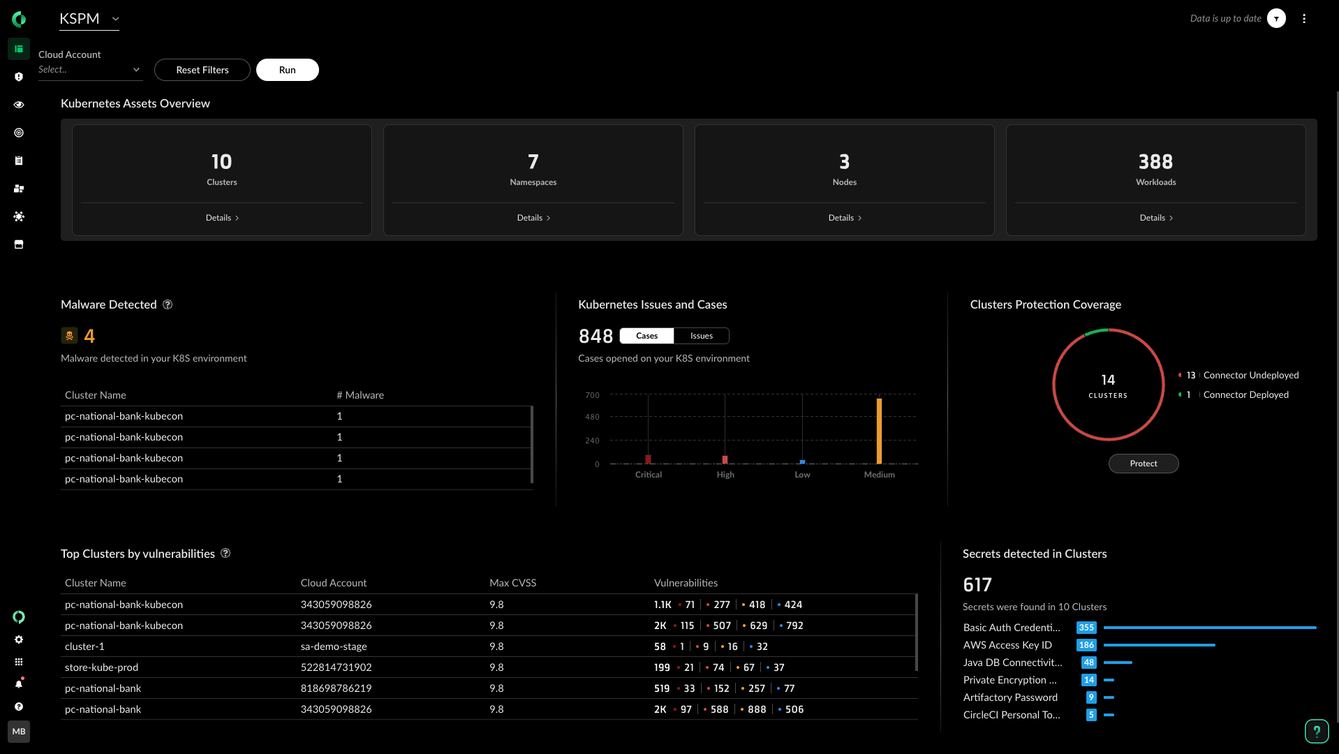 Individua e correggi le configurazioni errate di Kubernetes e i rischi per la sicurezza con una procedura di correzione guidata. Rafforza il livello di sicurezza Kubernetes e assicura la conformità ai benchmark CIS per cluster Kubernetes EKS, AKS e GKE.