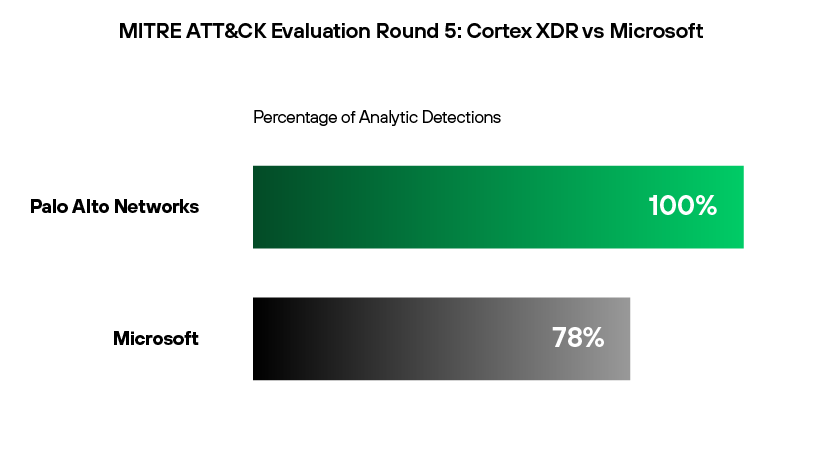 Microsoft Defender XDR non soddisfa gli elevati requisiti di visibilità e rilevamento necessari per difendersi in modo efficace dalle attività degli autori di minacce sostenuti dagli stati-nazione di oggi. Nelle valutazioni MITRE ATT&CK 2023 (Turla) che hanno sottoposto vari prodotti EDR alle immissioni nella rete e ai backdoor utilizzati dal servizio di sicurezza federale russo, Microsoft ha evidenziato un tasso di rilevamento analitico del 78,3%, contro il 100,0% di Cortex XDR. Con il tasso di rilevamento riportato da Microsoft, il 21,7% dei passaggi secondari attuati da questi strumenti informatici non ha comportato un rilevamento dell'endpoint, mentre Cortex XDR ha rilevato tutti i passaggi secondari.